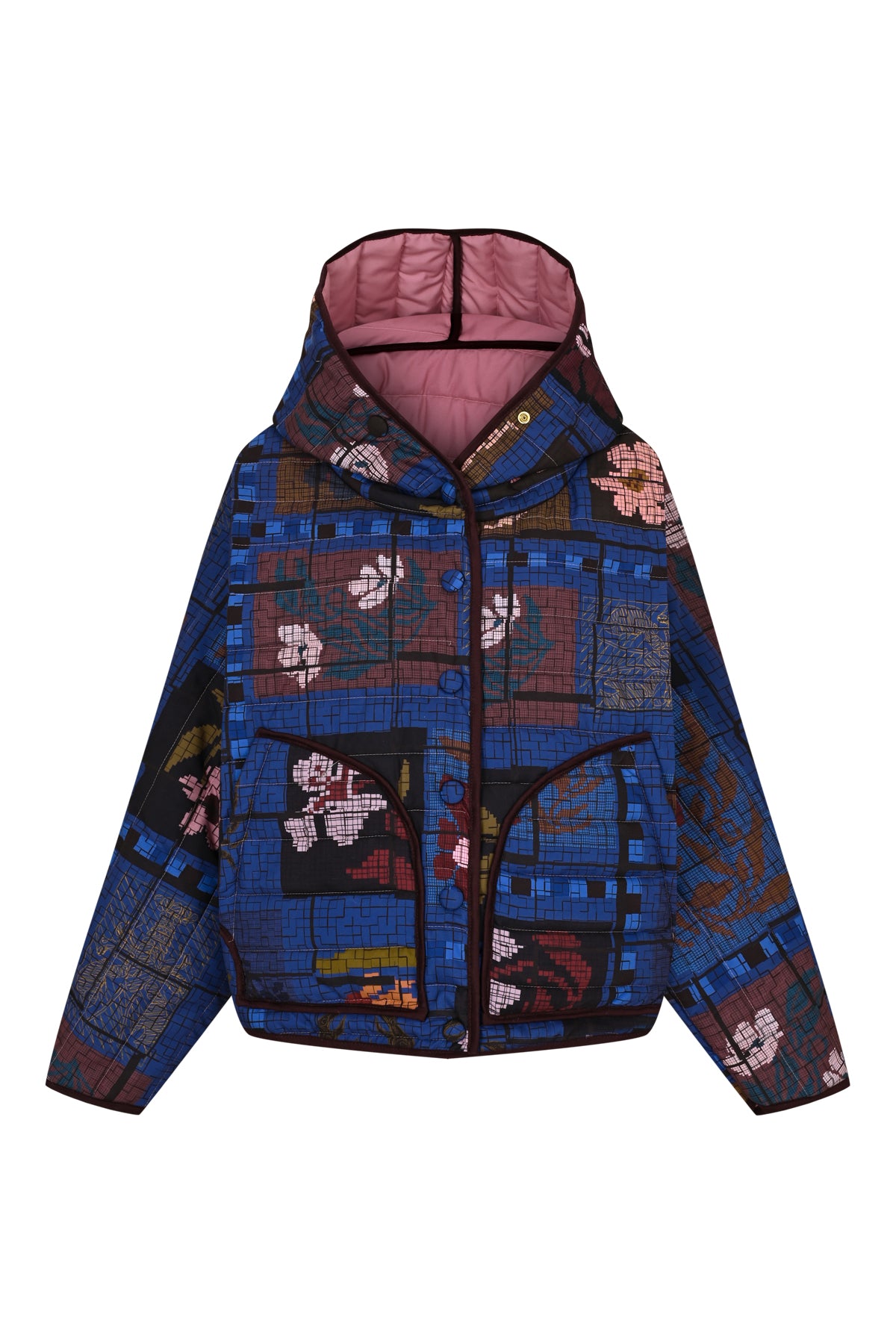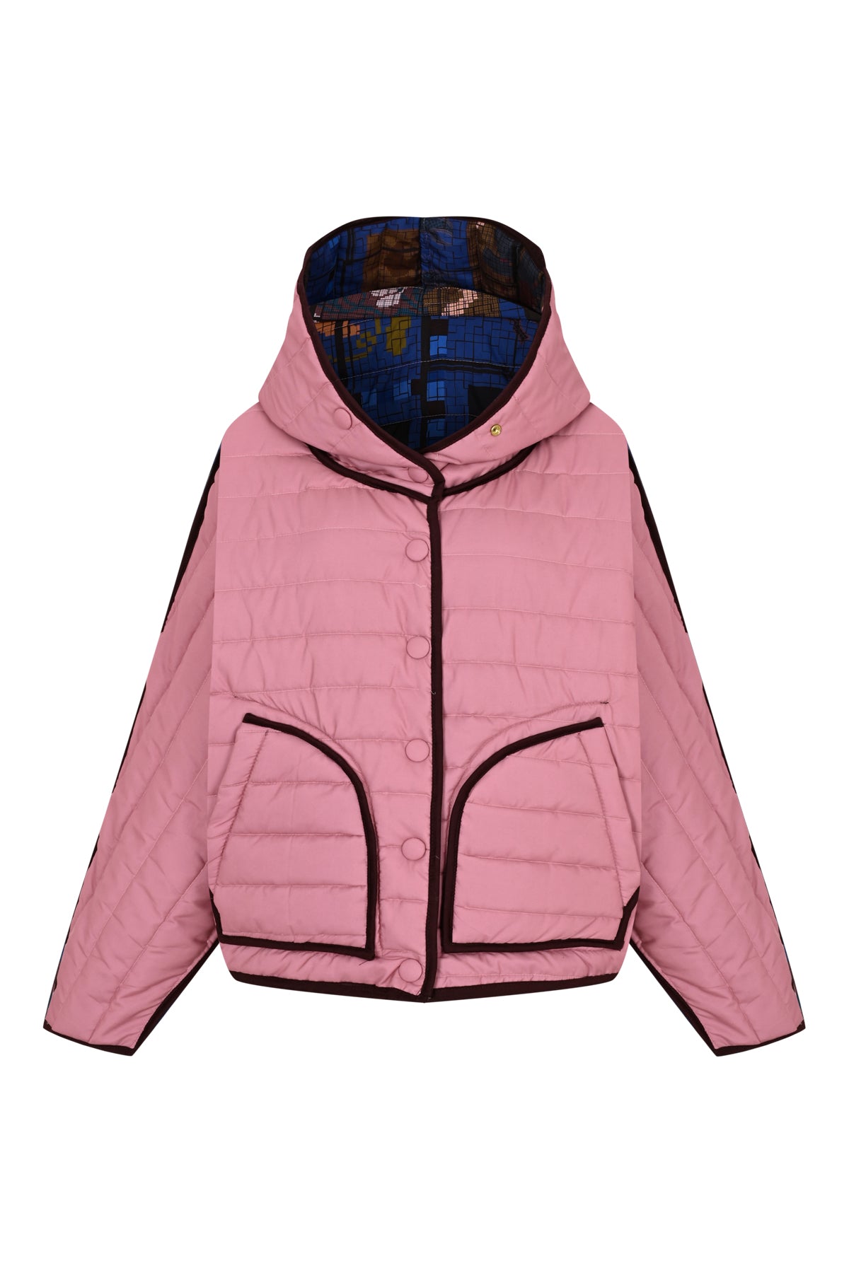 Chaqueta acolchada oversize reversible con capucha, detalles de ribetes, cierre con botones a presión y bolsillos interiores y exteriores, confeccionada en tejido impermeable.