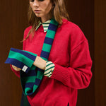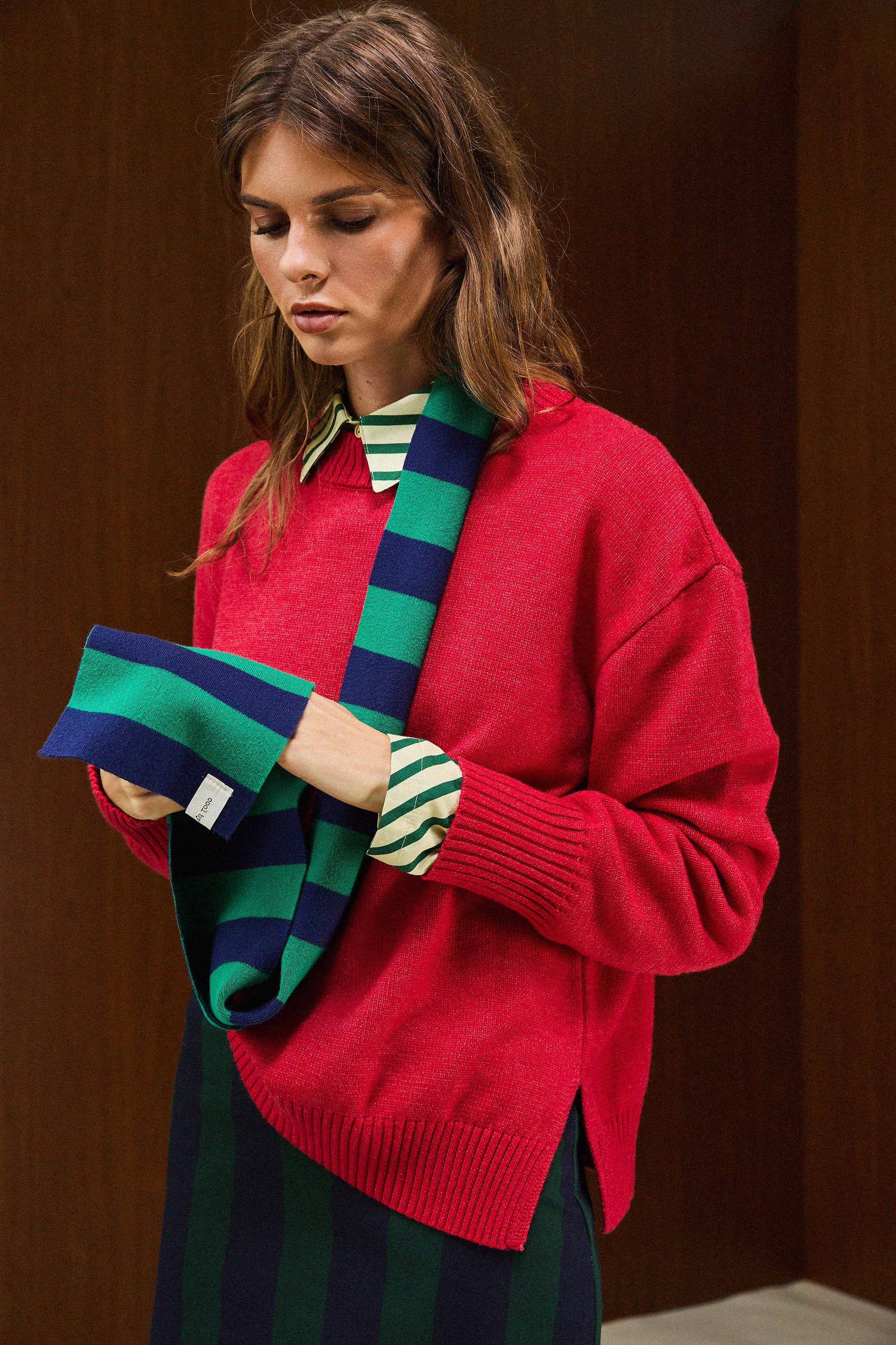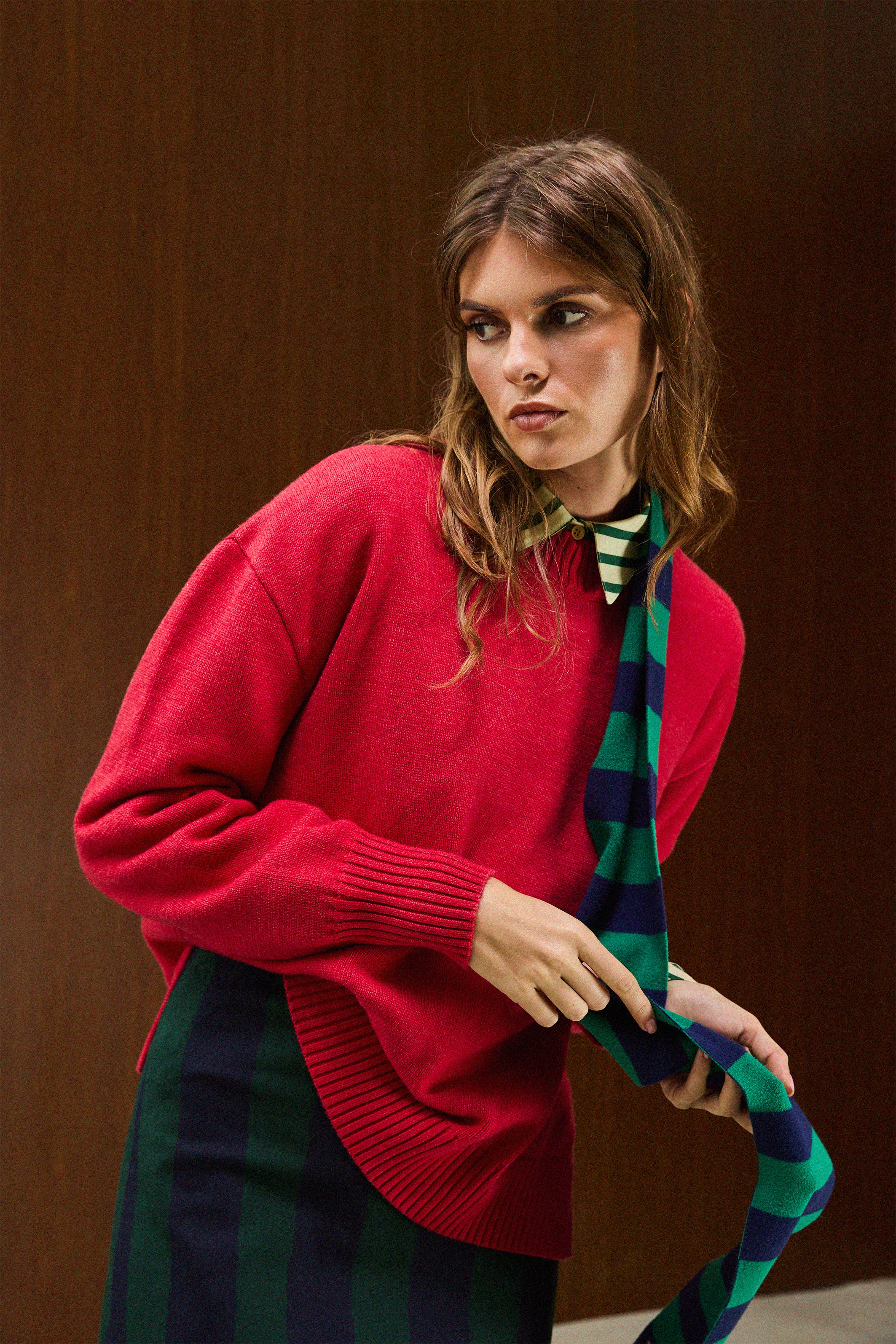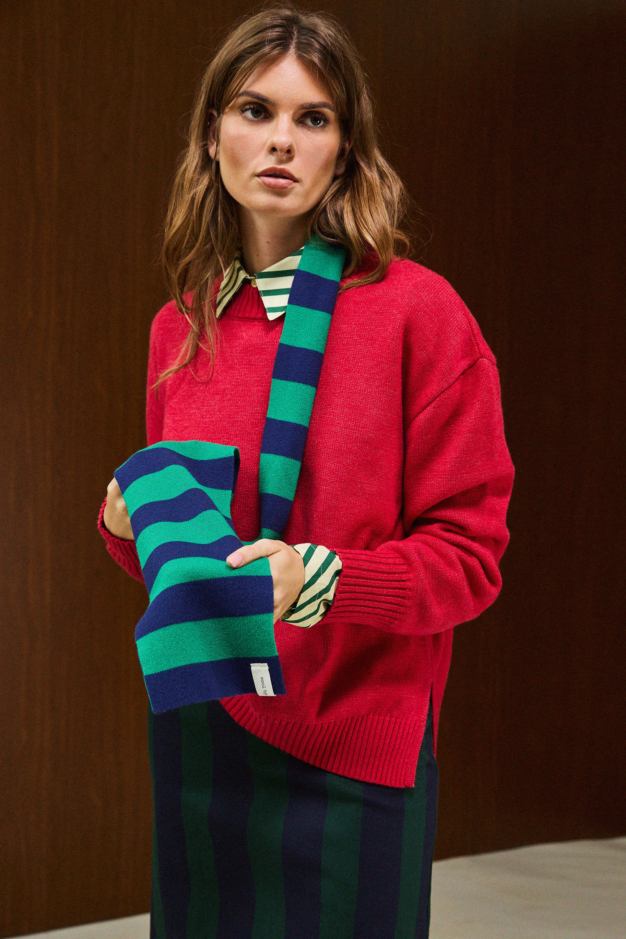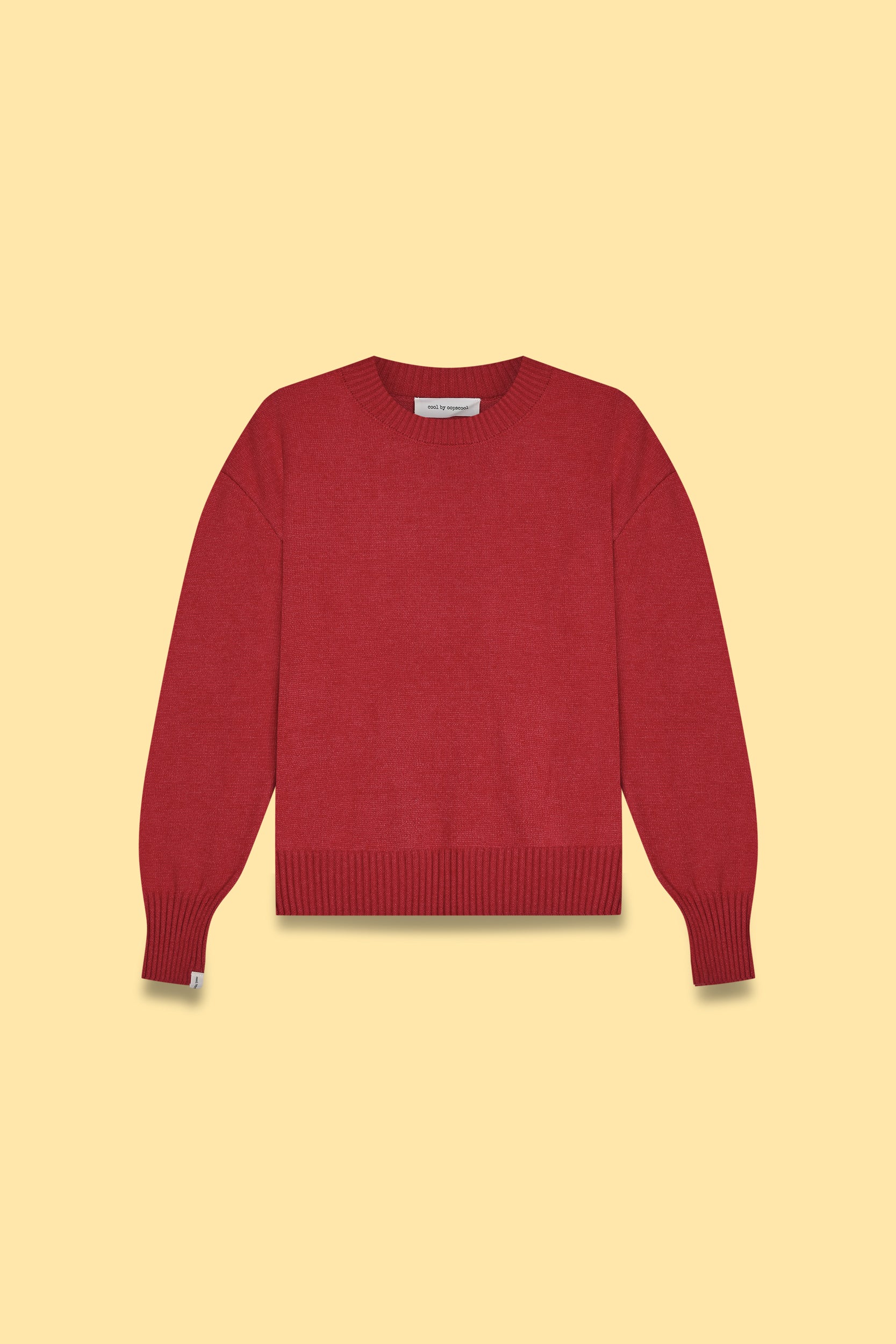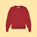Crew-neck knit sweater with long sleeves, ribbed neckline, cuffs, and hem.